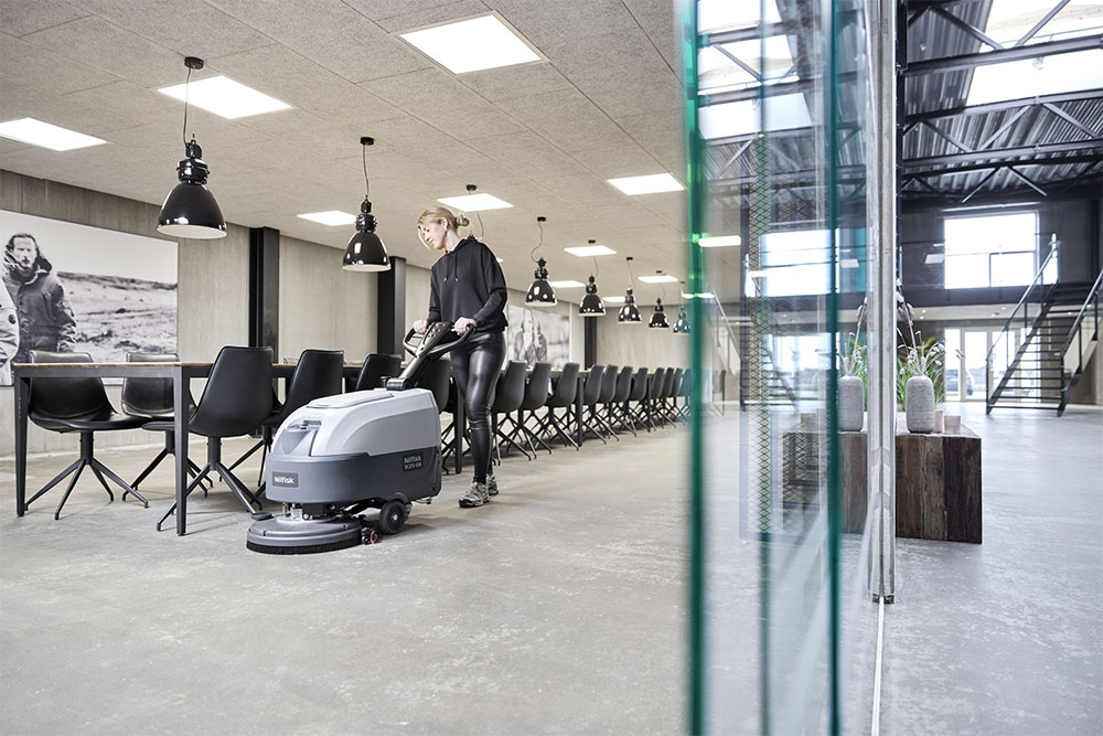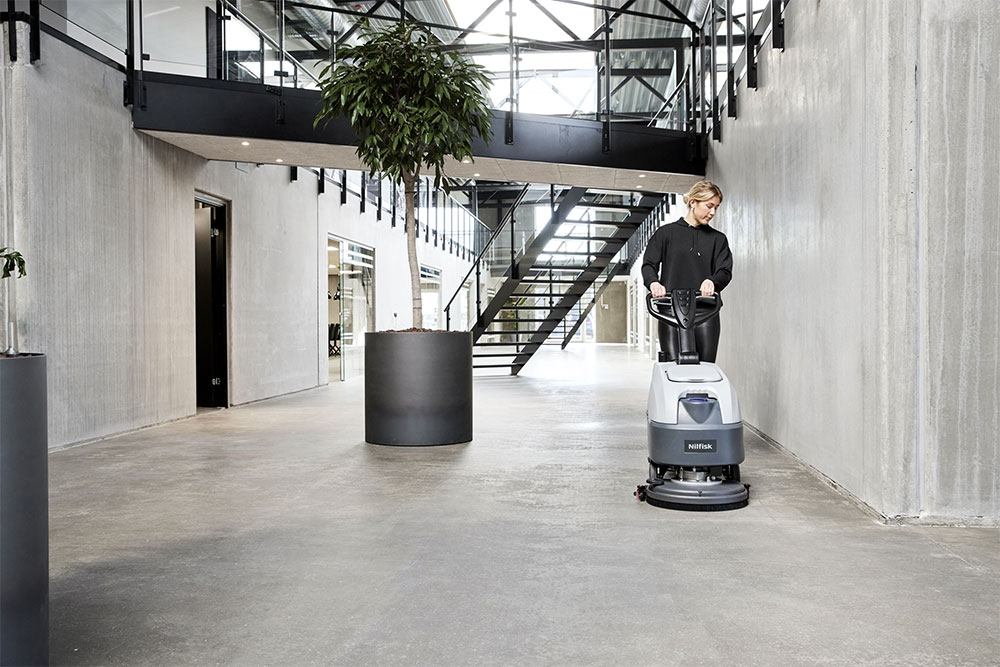 Die Nilfisk SC370 ist eine kompakte batteriebetriebene Nachläufer-Scheuersaugmaschine für die tägliche, mittelgroße Bodenreinigung mit intuitiver Bedienung, zuverlässiger Leistung und geringerem Wasser- sowie Reinigungsmittelbedarf.